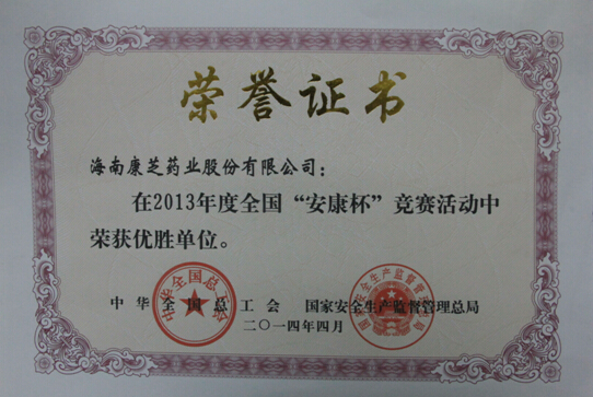近日,中華全國總工會、國家安全生產監督管理總局向康芝藥業授予了2013年度全國“安康杯”競賽活動“示范單位”榮譽稱號,并頒發牌匾及榮譽證書以資鼓勵。