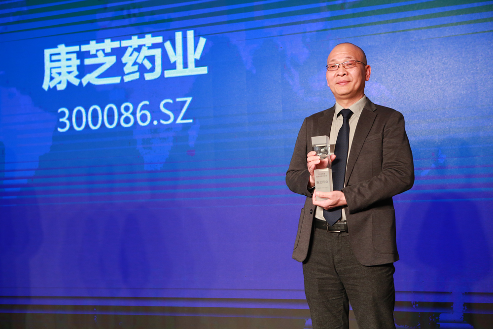 當晚,在交流晚宴后,頒獎典禮隆重舉行。康芝藥業等20家優秀上市企業代表先后登臺領獎。