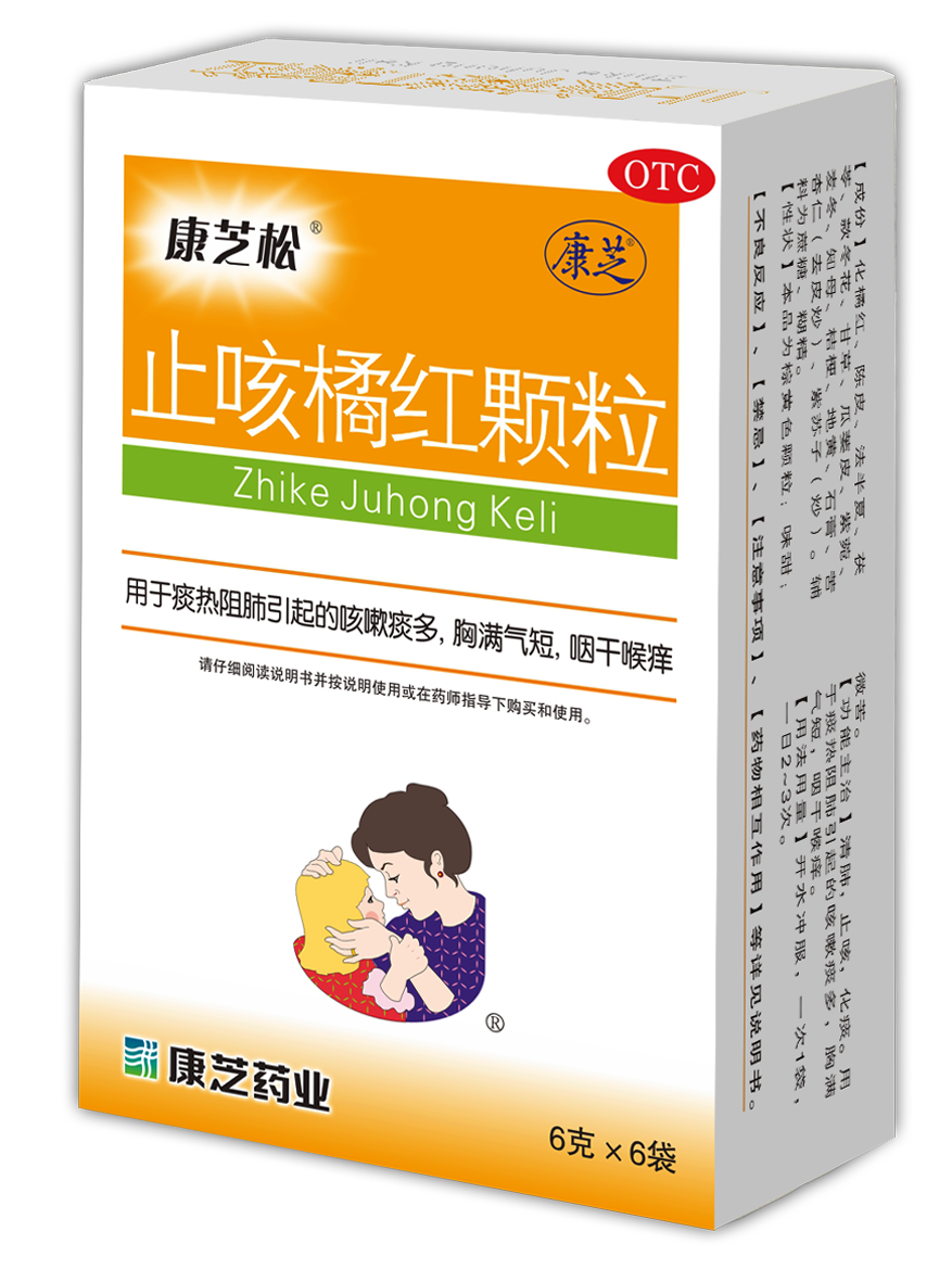 康芝松?(止咳橘紅顆粒)是康芝藥業(yè)兒童止咳系列明星產(chǎn)品,亦為獨(dú)家品種、全國醫(yī)保乙類產(chǎn)品、國家二級中藥保護(hù)品種??抵ニ芍饕饔脼榍宸?、化痰、止咳,用于治療痰熱阻肺引起的咳嗽痰多,胸滿氣短,咽干喉癢。其配方中的君藥采用了來自廣東化州的“正毛化橘紅”,是化橘紅中的珍品。