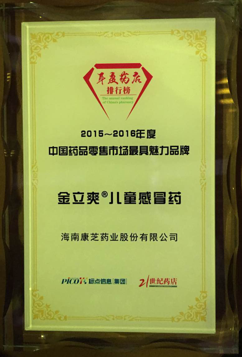 11月24日晚,由CFDA南方醫藥經濟研究所指導、《21世紀藥店》舉辦的2015-2016年度中國藥品零售市場品牌評選活動在廣州白云國際會議中心揭曉結果??抵ニ帢I旗下金立爽?兒童感冒藥在眾多品牌中脫穎而出,榮獲“2015-2016年度中國藥品零售市場最具魅力品牌”稱號。