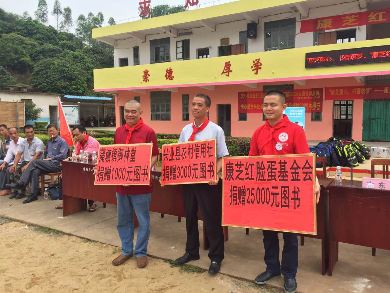 廣西玉林興業縣教育局鄧廣芳局長,玉林蒲塘鎮文東黨委書記、余健鎮長等領導,興業縣農村信用合作社代表龐一秋、蒲塘鎮御林堂大藥房廖永林等愛心人士,和蒲塘鎮中心小學校長謝宗海等也出席了捐贈儀式。