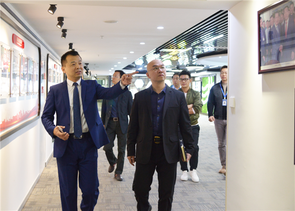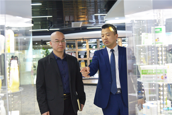 康芝藥業(yè)副總裁王勇(左)帶領(lǐng)來訪領(lǐng)導(dǎo)參觀