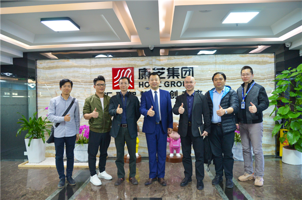 廣州市越秀區(qū)民政局局長(zhǎng)何巍(右三)、黃花崗科技園黨工委書記雷金源(左三)一行與康芝藥業(yè)副總裁王勇(左四)等合影