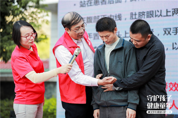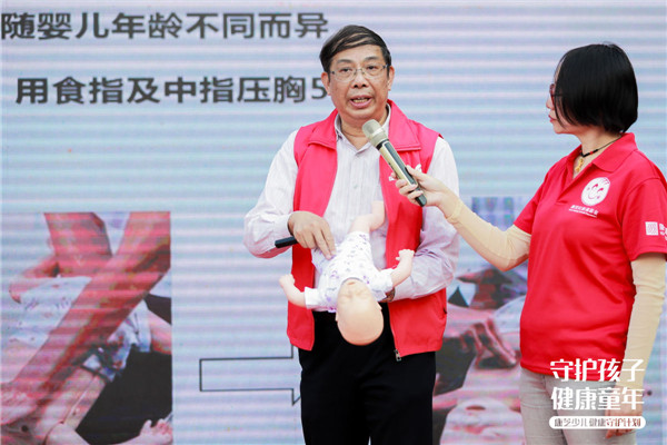 其中,結合當前兒童常見意外情況,丘教授著重給現場孩子家長講解了如何正確應對兒童氣道異物梗阻狀況。為了讓現場聽眾更直觀地了解“海姆立克”急救手法,丘教授使用了仿真嬰兒進行現場教學,此外,還邀請了兩名家長上臺進行真人示范,確保孩子及家長實際掌握到該急救手法。