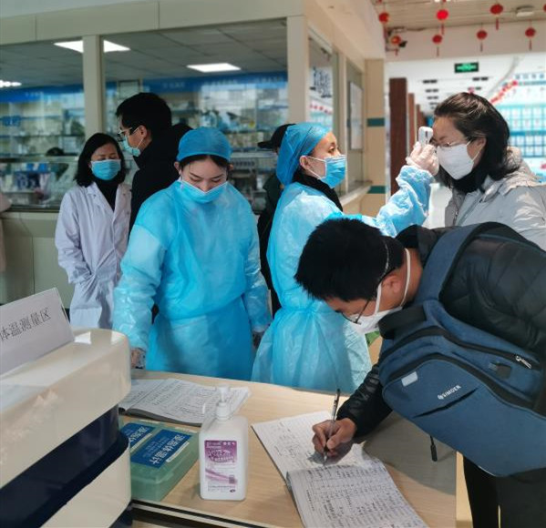 醫院嚴格按照疫情防控要求,將員工通道與患者通道分開,患者從門診大廳進入醫院,而醫護人員從側門進入醫院,不管是正門還是側門,都設立了發熱預檢點。醫護人員24小時值班,嚴防死守,不漏一人,對進入醫院的患者及家屬,醫護人員、后勤人員等在內的所有人員進體溫測量,及時識別可疑病例,做到“早發現、早報告、早隔離、早治療”。