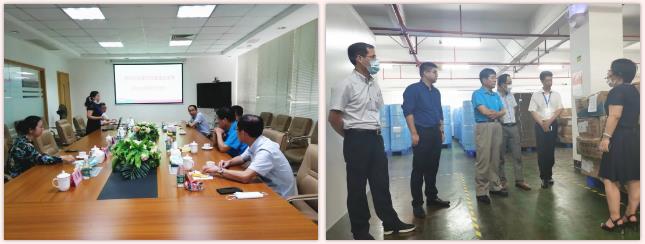 隨后,一行人參觀了中山愛護洗衣液生產車間、免洗手消毒凝膠生產車間及口罩生產車間等。調研查看了公司產品,特別是防疫產品的生產、產能和庫存等情況。