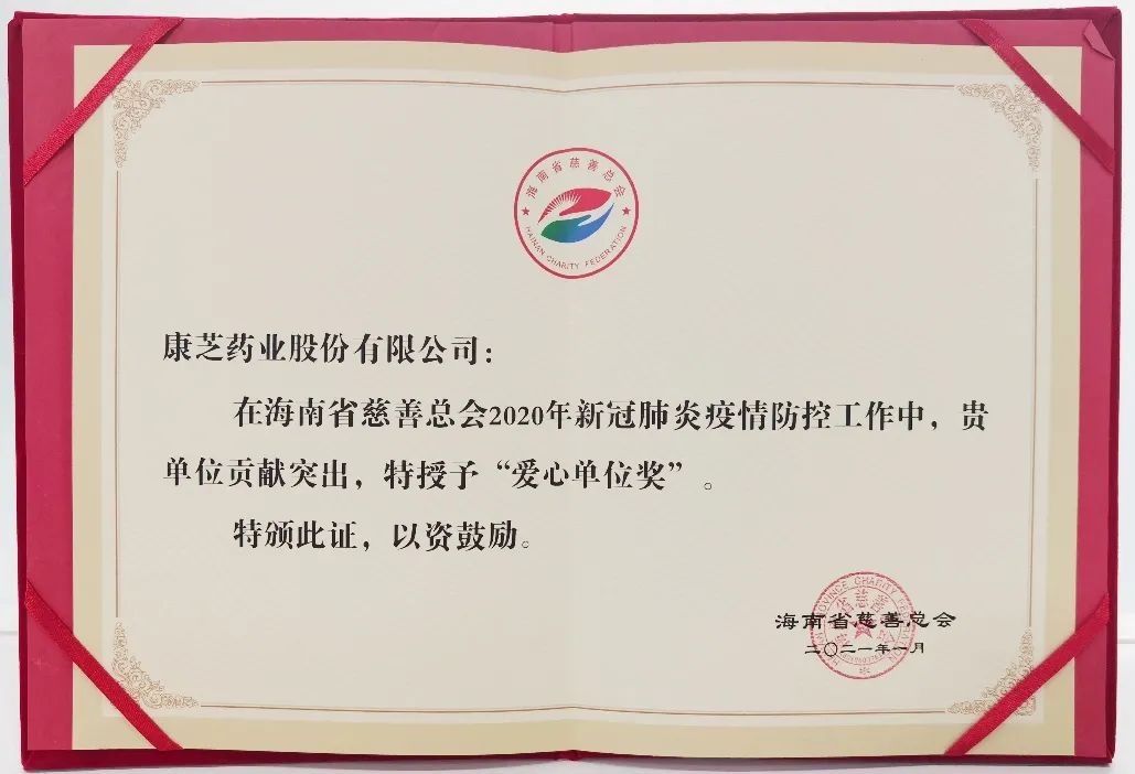 康芝藥業獲海南省慈善總會新冠疫情防控榮譽表彰