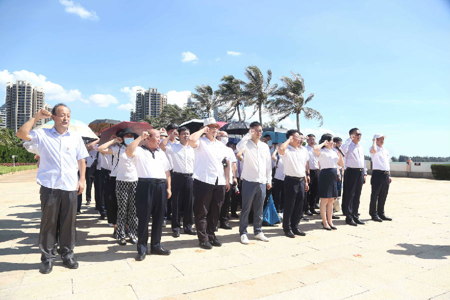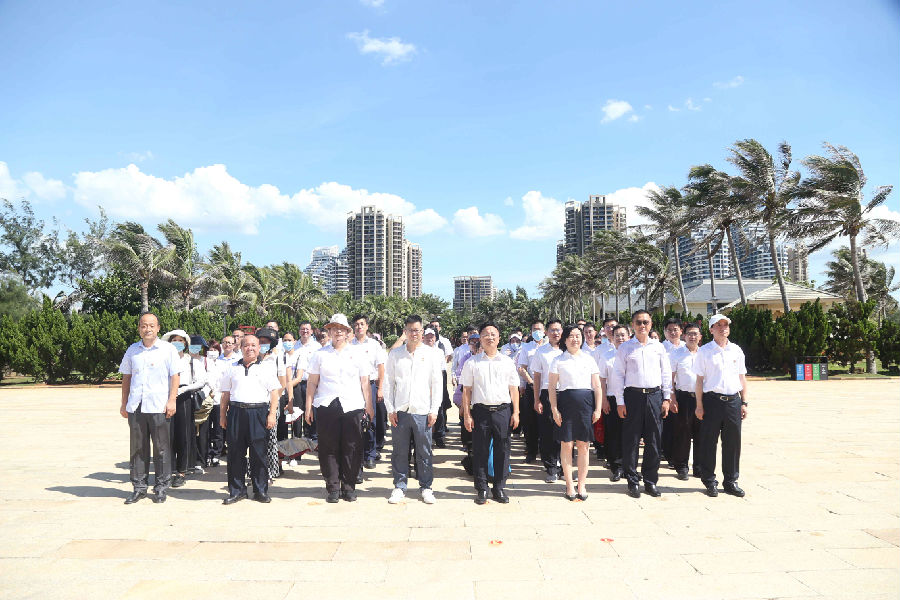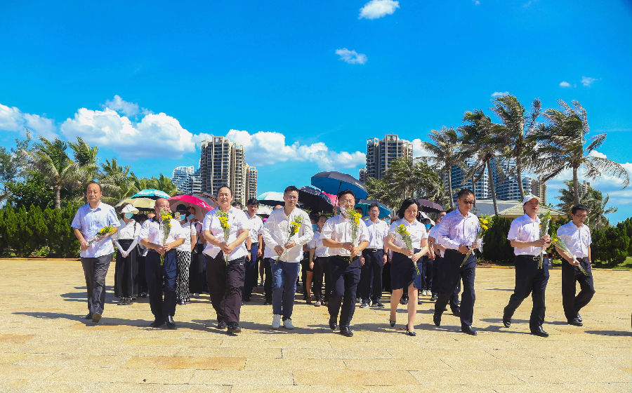 在海南臨高角解放公園,來(lái)自康芝藥業(yè)黨支部攜手華夏銀行海口分行黨委的全體黨員干部、預(yù)備黨員、入黨積極分子在革命烈士紀(jì)念碑下敬獻(xiàn)花束,對(duì)烈士表示崇高敬意。
