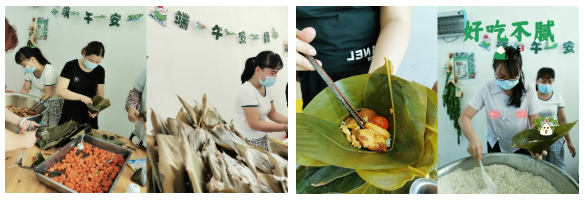 在這生產繁忙之際,生產技術部仍借調3名員工到后廚幫忙包粽子,只為保證員工們能吃上新鮮可口的粽子。雪白的糯米、青翠的粽葉,在一陣眼花繚亂的包、裹、纏、繞后,變成了有棱有角的粽子。大家你一個、我一個,將粽子全部包好,供員工們午餐享用。