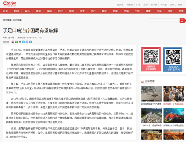 手足口病,危害中國兒童健康的高發傳染病,然而,目前該病在全球范圍內尚無針對性治療藥物。目前,這種局面有望得到破解——康芝藥業研發的兒童手足口病專用抗病毒藥物注射用蘇拉明鈉已獲得臨床試驗批件,如臨床試驗成功并獲許生產,蘇拉明鈉將成為全球首個治療手足口病的新藥。